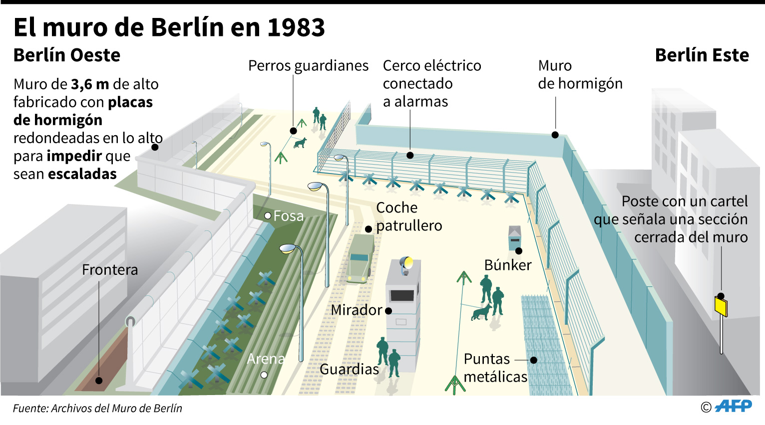 La pared del muro era en realidad doble, y entre ambas se extendía la llamada “Franja de la Muerte”, de hasta 90 metros de ancho en algunos sectores. Quien trataba de escapar la tenía muy difícil, pues debía sortear alfombras con púas, barreras antitanques, barricadas, cercas electrificadas y minas antipersona, por no hablar de los guardias armados y perros apostados en las torres de vigilancia.