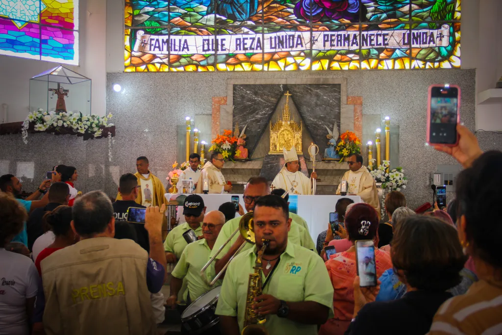 Trompeta, tambor, charrasca y saxofón. Una banda entra a la iglesia y comienza una fiesta. Adentro la gente se agolpa en busca de puestos disponibles. La misa oficiada por el obispo empezará después de terminar el rosario. Afuera los curas de distintas parroquias llegan, se saludan, se abrazan, celebran.