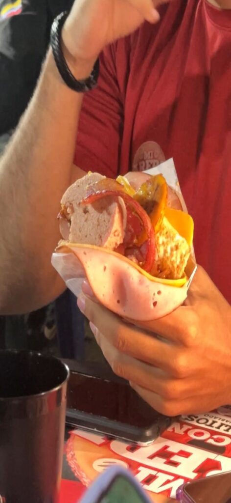 Después, la ruta endiablada de la arepa llegó a Puente Hierro, y en “Arepa & Burguer”, los participantes disfrutaron de “La Mañanera”, a base de queso guayanés, Diablitos y huevo, y una arepa especial servida con cubiertos y que la llaman “la universitaria”, lleva Diablitos, queso fundido, jamón, queso amarillo, tocineta, tajadas y huevo.