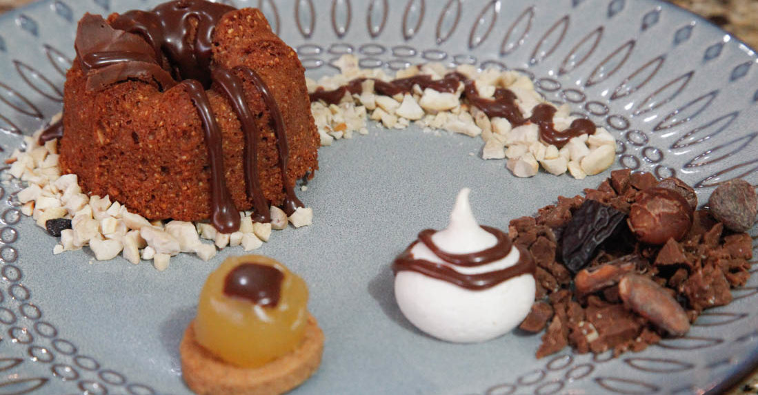 «El amazú es un homenaje al Amazonas partiendo del chocoazú, con harina de yuca amarga, merey y suspiros aromatizados con sarrapia. Puede llevar también un ganache de copoazú con fragancia de manaca», dice Antonella.