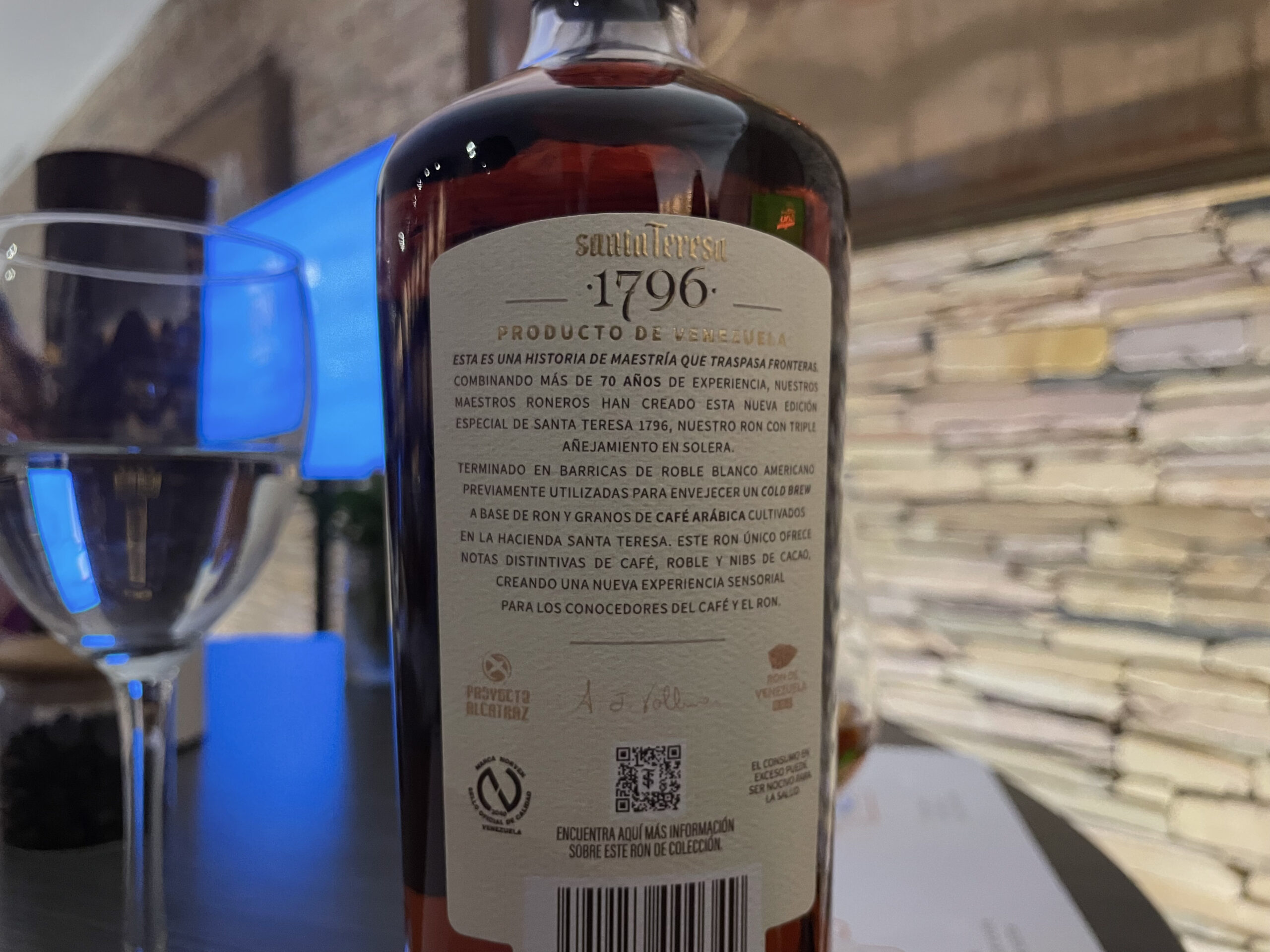 «Esto se hizo con ron muy añejado y ese ron es top secret. Se hace un colado de ron especial mezclado con café triturado, que luego entra a las barricas y pasa no menos de seis meses dentro de las barricas. Eso le da tiempo a las barricas de absorber ese ron con café. A los seis meses, o más, se vacía y la madera queda impregnada de ese ron con café y lo que se produce es 1796 y pasa tres meses o mas hasta extraer ese sabor de las paredes de la madera de los barriles de roble», agrega Vollmer.