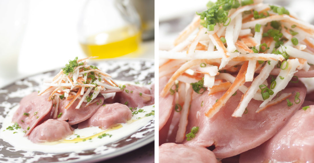 Raviolis de remolacha con queso de cabra y cangrejo