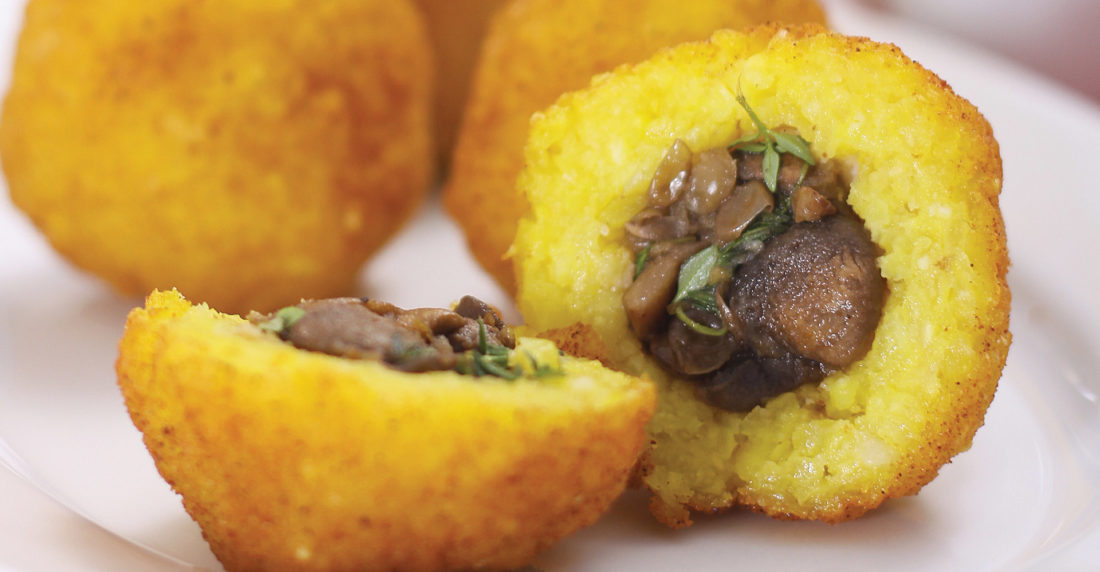 2. Tome una porción del arroz con una cucharilla y haga una bolita. Extiéndala en la palma de su mano y rellene con una cda. de la mezcla de champiñones y cierre. Pase por pan rallado y fría en abundante aceite caliente.