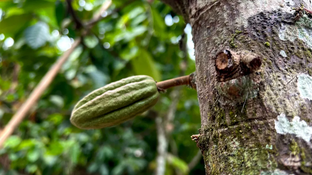 Cosecha. La clave es identificar el punto óptimo de madurez de las vainas, lo cual requiere conocimiento experto debido a las variaciones en color y forma entre las diferentes variedades de cacao. Las vainas de cacao no maduran simultáneamente, lo que complica el proceso.