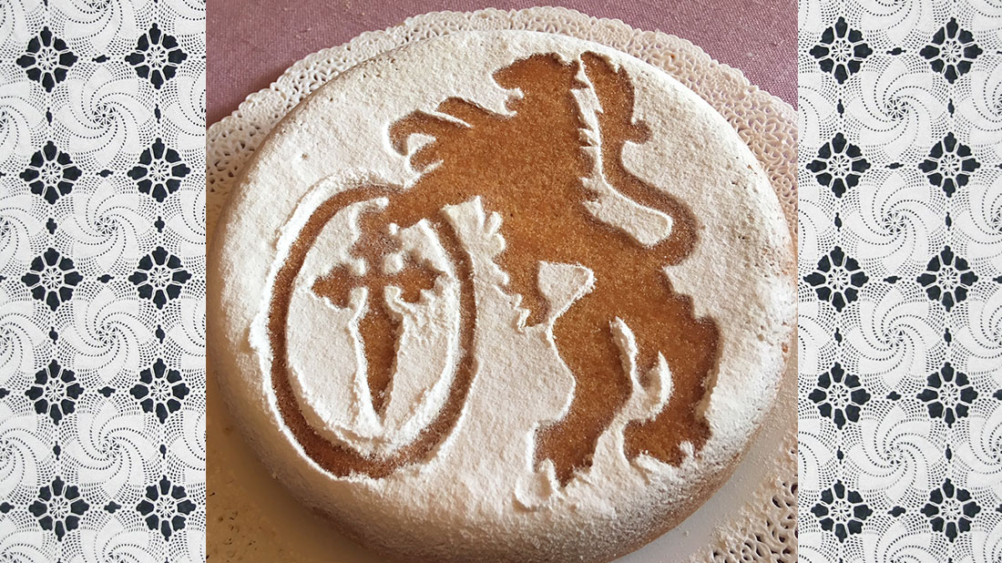 Como decoración lleva en azúcar glass el León de Caracas que originalmente porta la cruz de Santiago, hecha con una plantilla realizada por la propia Carmen.