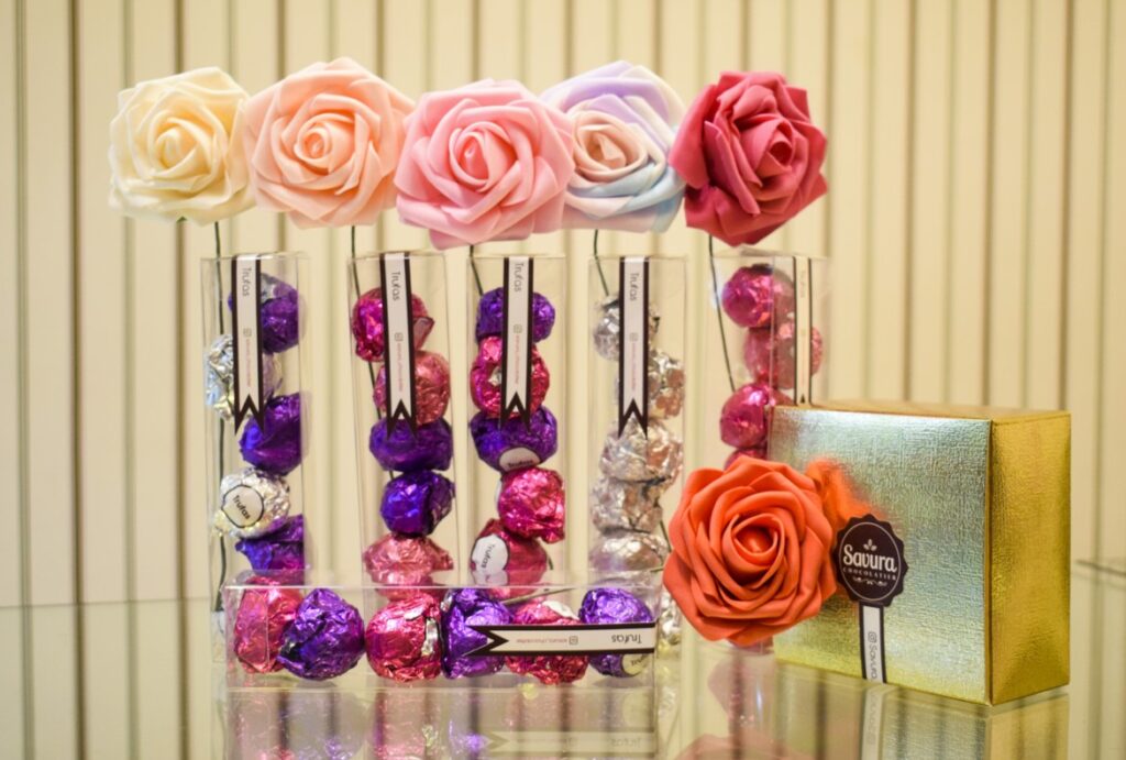 Además de bombones y barras, Savura ofrece otros productos derivados como mezclas para hacer tortas y brownies, tabletas de marcas menos conocidas como Urbano Chocolates, y café. Para el Día de la Madre han preparado variados paquetes de regalos decorados con flores, incluidos los bombones de la línea saludable.