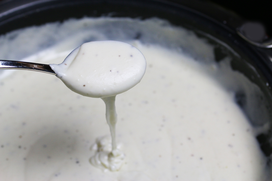 Cuando la bechamel se separe de las paredes de la olla, ya está lista. No te preocupes si parece muy líquida, porque al enfríar espesa. Incluso después de quitar la olla de la hornilla, sigue removiendo un poco, para distribuir el calor y que no se corte.