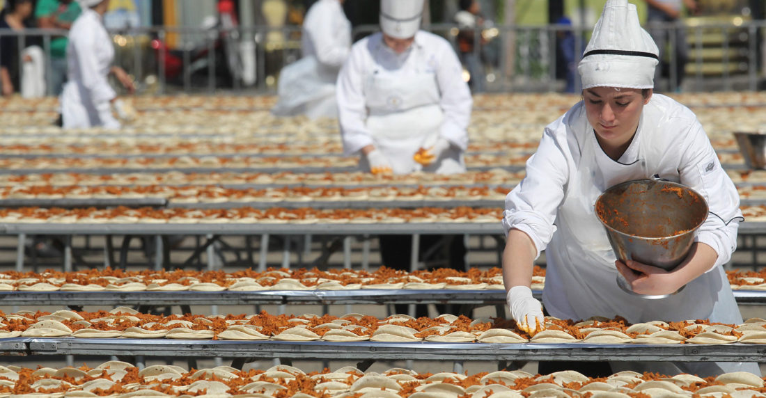 Las manos de 200 chefs prepararon durante seis días la cochinita pibil, un platillo típico de Yucatán a base de carne de cerdo con una salsa de jugo de naranja agria, achiote, canela, chile y otras especias; ingredientes horneados en un pozo al ras de suelo envueltos en hojas de plátano.