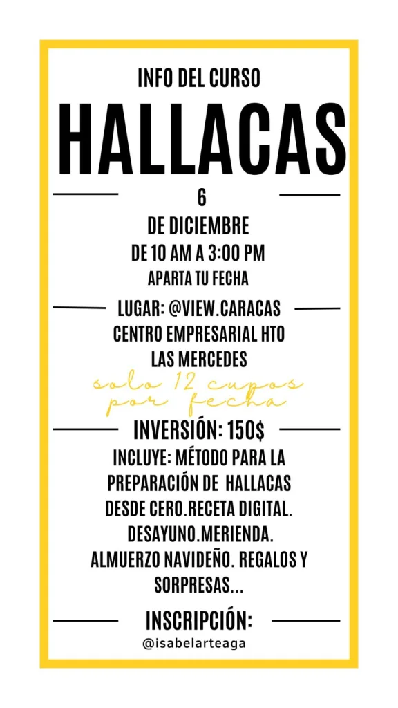 Los próximos talleres se dictarán el 23 y 29 de noviembre, 6 y 12 de diciembre. No se lo pierdan,van a aprender a hacer hallacas en un santiamén. Se los asegura un “hallacadicto” irremediable. Comunicarse con @isabelarteaga