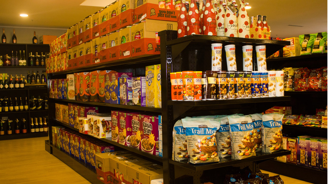 El bodegón de 180 metros cuadrados cuenta con una variedad de productos como whiskys, vinos, proseccos, cervezas, quesos, jamones, patés, y todo tipo de embutidos y delicateses, galletas, cereales, chocolates, gomitas y muchas otras opciones en la categoría de golosinas. Aunado a esto se suman a un abanico de productos de uso personal diarios como champús, enjuagues, jabones, pañales, cremas, entre otros.