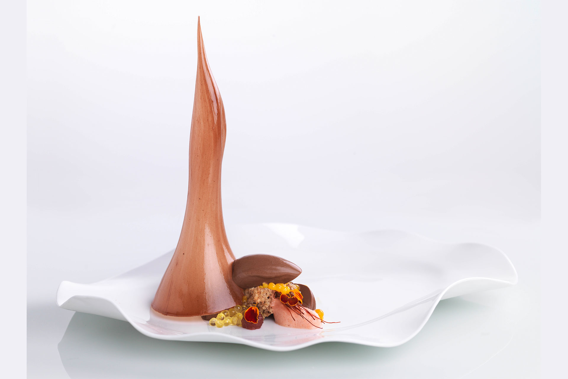 Para empezar, le dieron un chocolate de Valrhona llamado Guanaja, que cumple 40 años y fue el primer chocolate al 70% del mundo. Ese chocolate lo compararon con vinos y Dopico comparte: “Ahí se me prendió el bombillo por el perfil aromático de los vinos, que era similar a un chocolate de origen. Con la gente de El Celler de Can Roca hicimos un perfume hecho según el perfil aromático del chocolate. No olía a cacao pero olía a las notas frutales y frutos secos de ese chocolate en particular y todo iba relacionado con el tema del perfume.