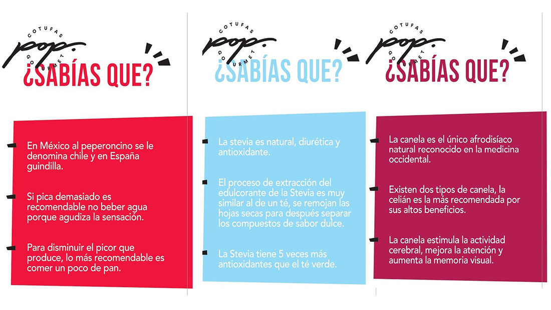 Otro aspecto interesante del producto es que, en el reverso de la etiqueta, las personas pueden encontrar datos curiosos sobre los ingredientes y sabores de las cotufas. De esta manera, los consumidores saben qué compraron mediante el uso de mensajes amigables y cercanos.