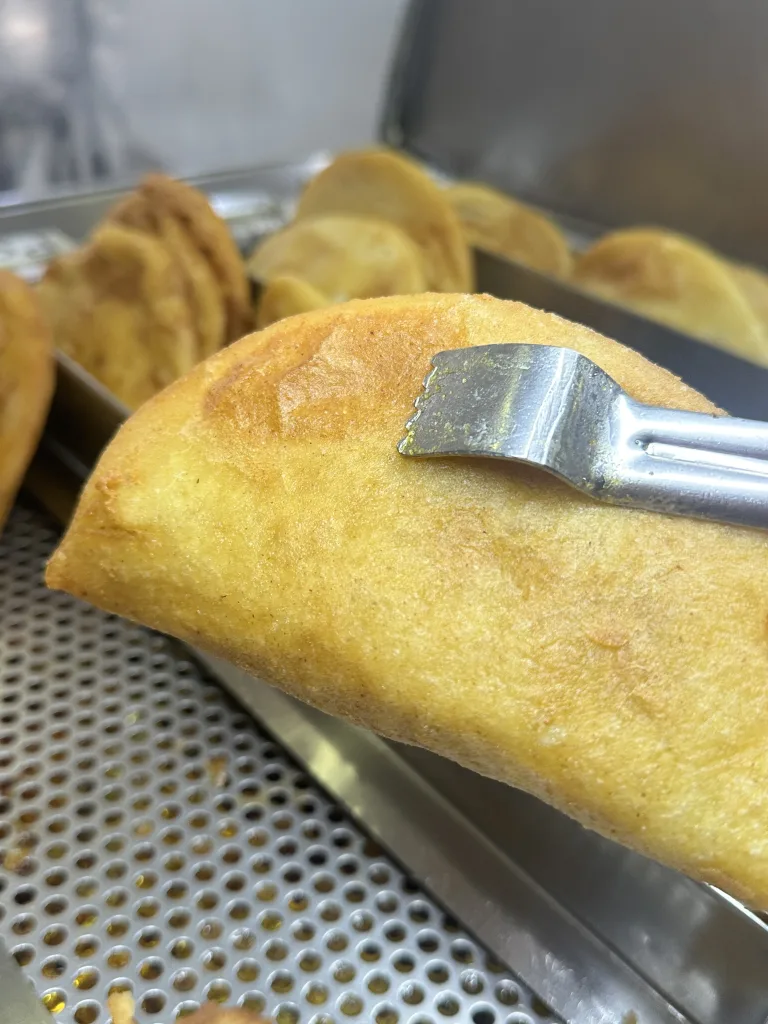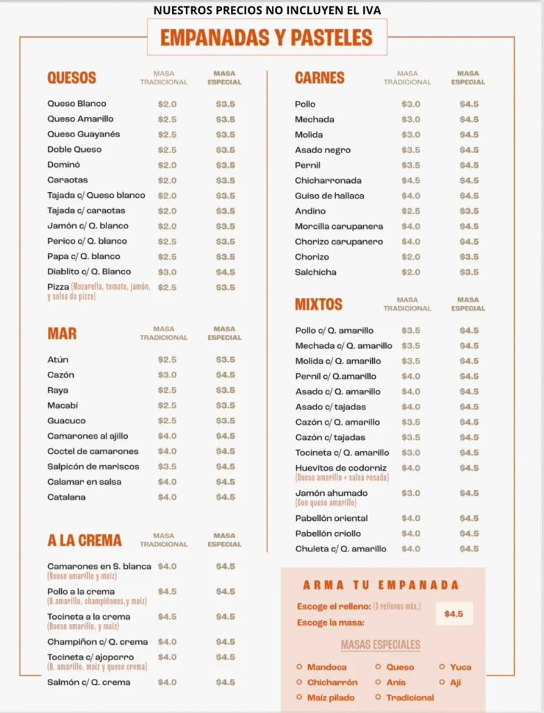 Tienen sabores fijos en el menú y otros especiales que solo preparan los fines de semana, pero todas las empanadas cuestan lo mismo. De lunes a viernes ofrecen queso, mechada, pollo, molida, jamón y queso, salchiqueso, cazón, catira (pollo con queso amarillo) y pelúa (carne mechada con queso amarillo).