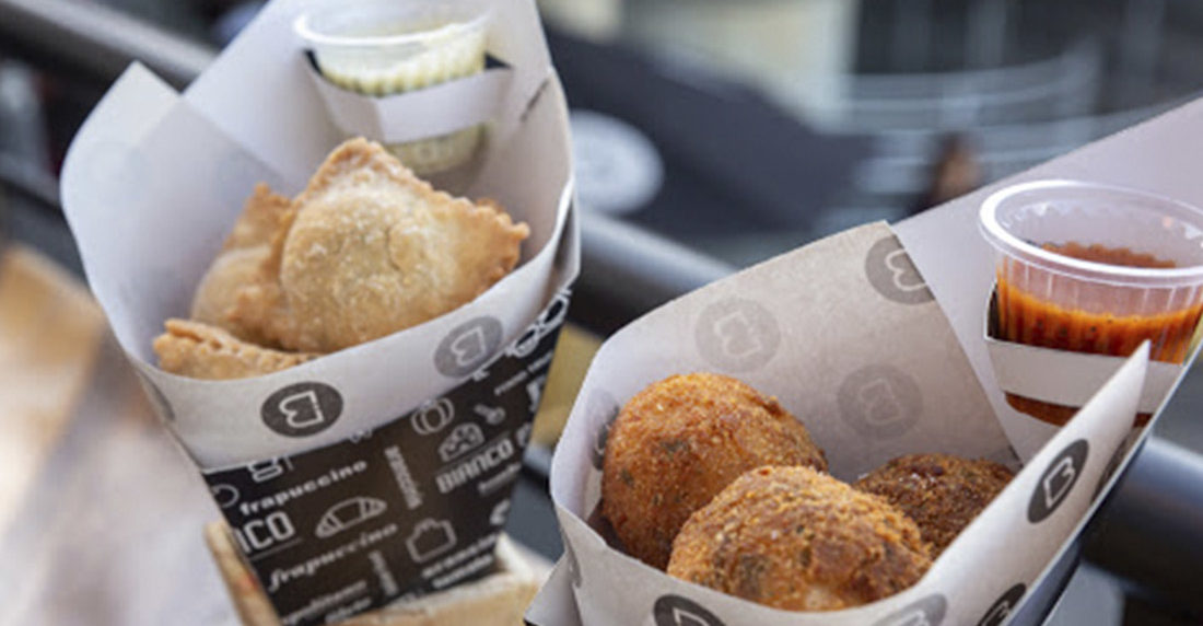 Ahora si, a lo que vinimos. De entrada Bianco ofrece los tradicionales arancini rellenos de carne, tequeños de pizza y sorprendentes raviolis fritos que son la ópera prima de esta comida rápida italiana.