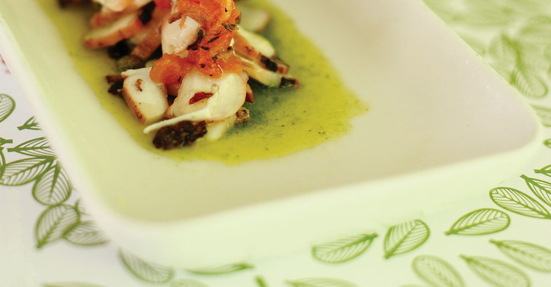 Corte el pulpo en ruedas, agregue el tomate confitado cortado en cuadros, la alcaparra, pasitas troceadas, un poco del aceite de los tomates y zumo de limón. Haga una línea con el pesto de rúcula y coloque el pulpo encima.