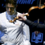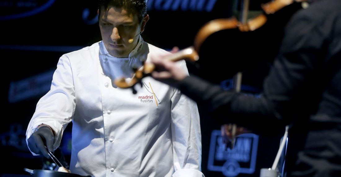 Acompañado de un violinista, con guantes negros y sólo iluminado por un foco dirigido a la mesa, cocinó sin pronunciar una sola palabra una muestra de los platos que ofrece en Akrame, su restaurante parisino, que logró dos estrellas Michelin a los seis meses de su apertura, que se suman a la que tiene en su establecimiento en Hong Kong.