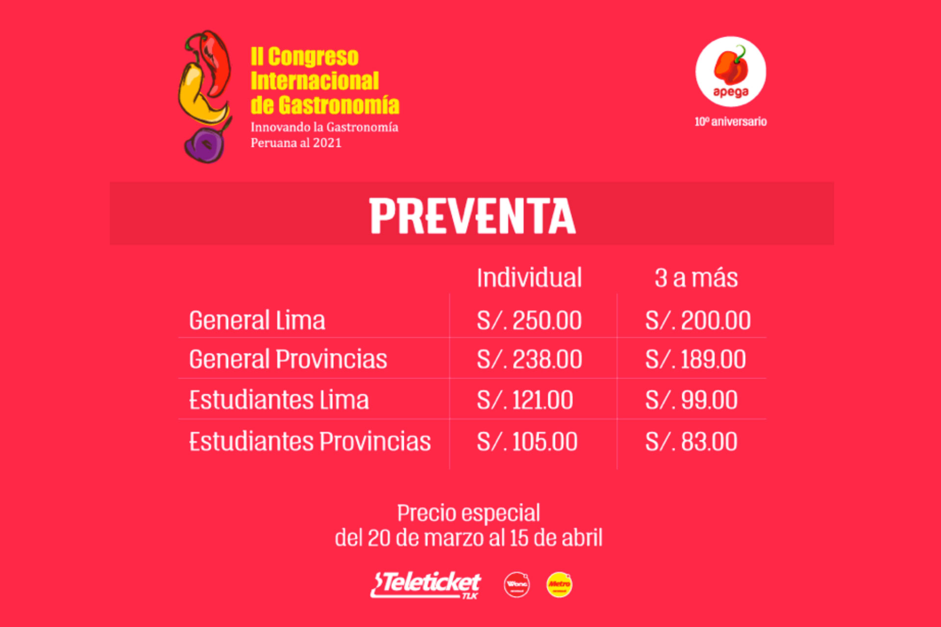 La Sociedad Peruana de Gastronomía, Apega, ya tiene todo listo para la segunda edición del II Congreso Internacional de Gastronomía los días 25 y 26 de abril, en el Círculo Militar de Jesús María en PerúEntre los invitados están la Asociación de Restaurantes de los Estados Unidos, que cuenta nada menos que con cerca de 500 mil asociados, el Basque Culinary Center del País Vasco, el Food Service Alliance, así como el Instituto ATÁ del reconocido chef brasileño Alex Atala, el Servicio de Apoyo a las Micro y Pequeñas Empresas.