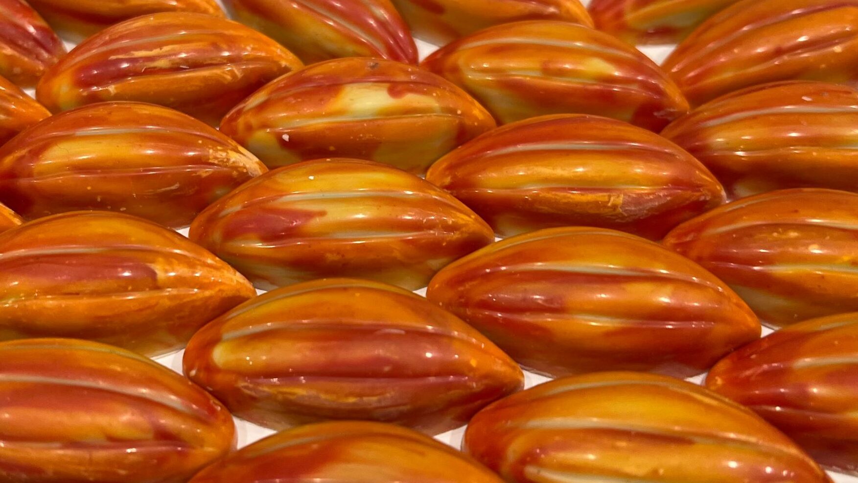 Posteriormente, probamos uno de los éxitos de la marca, el bombón Flor de parchita, suave caramelo de chocolate de leche con jugo fresco de parchita. Para la elaboración de este producto la técnica utilizada es el moldeo. Aquí, a través de unos moldes de propileno, se coloca una capa fina de chocolate derretido que después de estar sólido se procede a colocar el relleno líquido y posteriormente sellado con más chocolate.
