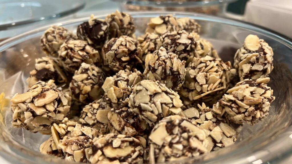 Comenzamos degustando un bombón de tronco relleno de crema de gianduja con crocante de almendras caramelizadas. La técnica para elaborar este productos es praliné, que consiste en un relleno a base de frutos secos caramelizados y triturados, con textura que va desde el grueso crocante, hasta una crema.