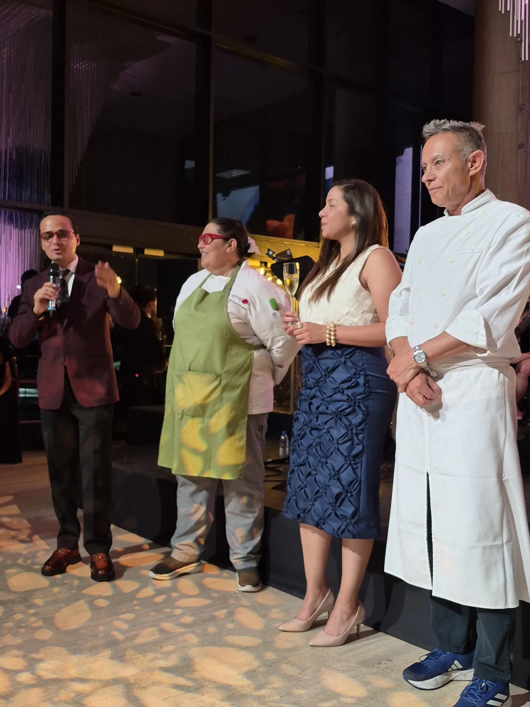 De inmediato, el servicio de camareros de Festejos Mar, en perfecto orden, procedió a servir el otro protagonista de la noche, el nuevo espumante Millésimé de Pomar Dama de Lara. Gracias a la breve cata dirigida por la enóloga Yenitza Escalona, quien orgullosamente permitió disfrutar de este gran espumante, que armonizó con el plato principal, la Curvina en corte de churrasco sobre risotto de parmesano, napado con salsa de carne y hongos porcini deshidratados. Dama de Lara demostró su elegancia, estructura y potencia.