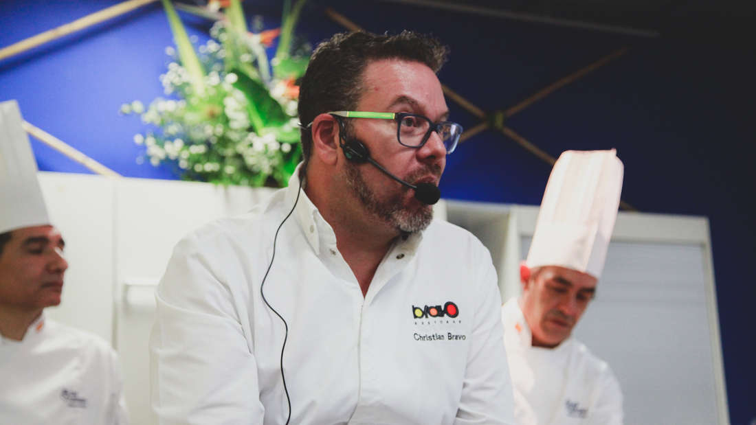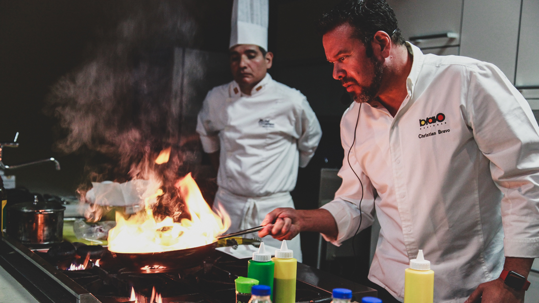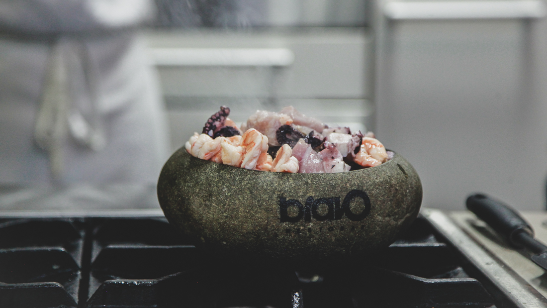 Con escándalo de humo, el calor de las piedras selló el ceviche por un lado, mientras el chef colocaba rápidamente el resto de los ingredientes del plato: camarones y pulpos ya cocidos, leche de tigre (el jugo que resulta de la marinada del ceviche), salsa de soya, cebolla morada, tiras de ají picante, cilantro y cancha (maíz tostado). Este plato, creación de Bravo, se llama Ceviche caliente a las piedras y pertenece al menú de Bravo Restobar, uno de los 3 restaurantes que tiene este chef en su país. Fue también una de las 3 preparaciones que elaboró durante las master class que vino a dictar a Caracas.