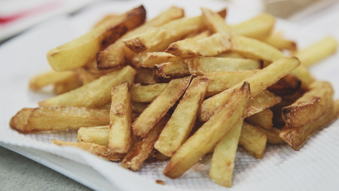 «Prefiero colocar las papas a un lado para mantener la textura crujiente», explica Bravo y cuenta su técnica: Esas papas se fríen tres veces, la primera vez quedan blandas y en las siguientes ocasiones van logrando la capa crujiente que se mantiene en el tiempo. Es sólo al final cuando se le agrega la sal.