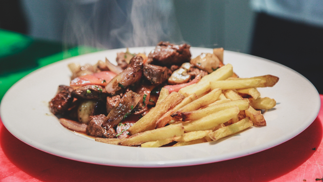 Al final, fuera del fuego, le coloca tomate en julianas y cilantro. Lo sirve con las papas fritas a un lado, que es tendencia actual, porque la receta original las mezcla con la carne ya salteada.