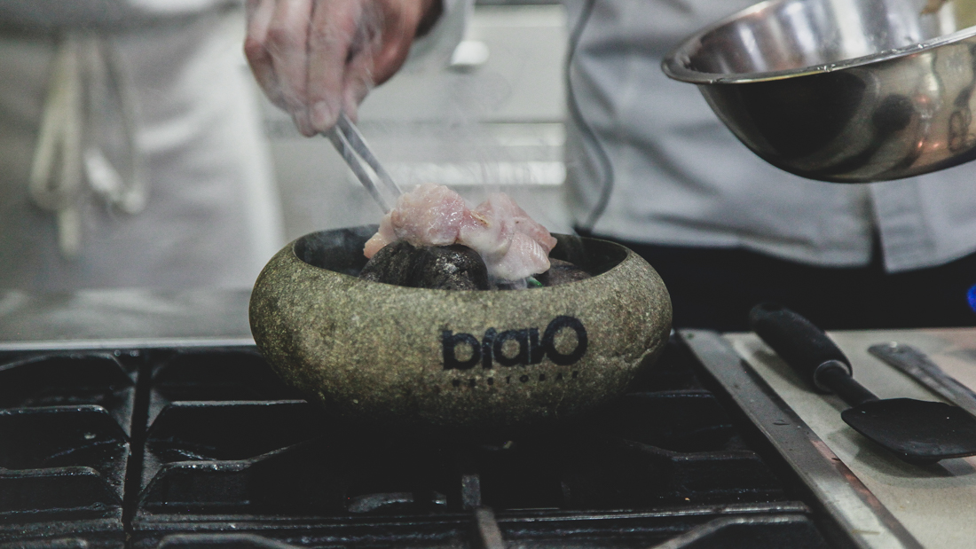 Se cocina sobre piedras de río bien limpias que se calientan un buen rato directamente sobre la brasa de la hornilla. Así, hirviendo, se colocan sobre un plato cóncavo también de piedra y sobre ellas, de inmediato, un ceviche tradicional que el chef peruano Christian Bravo había preparado unos minutos antes.