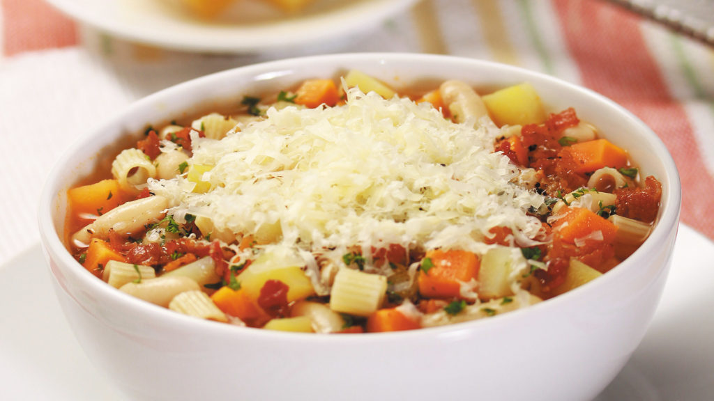 El minestrone es una confortable sopa italiana que es tan completa que puede ser un plato único. Por algo se llama «minestrone», que significa «sopa grande».