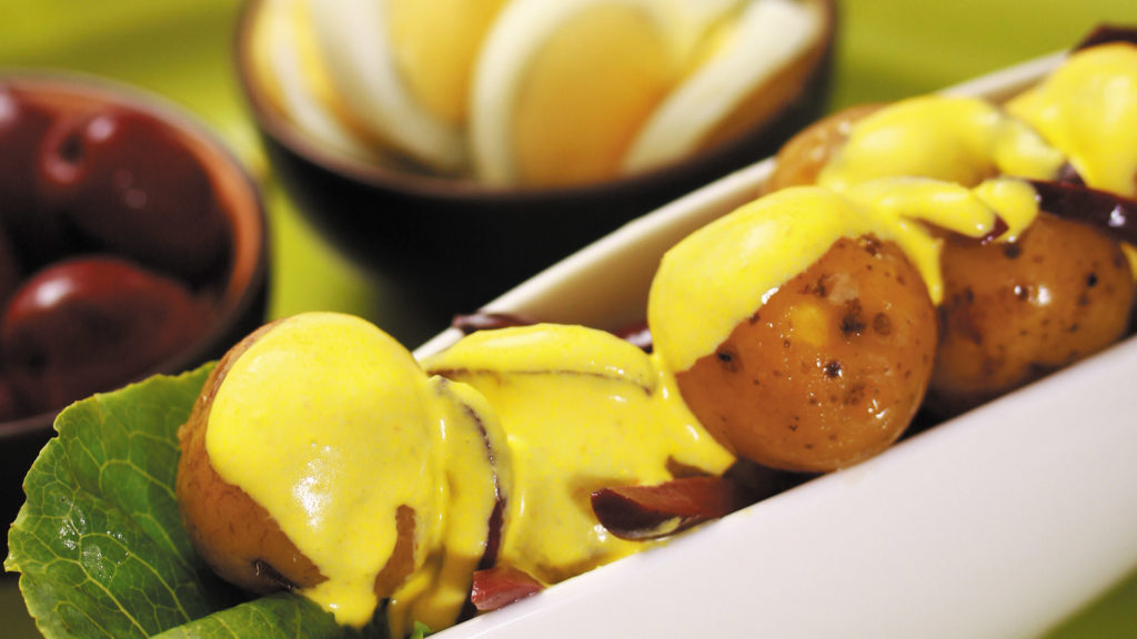 Para servir, coloque las papas sobre hojas de lechuga (esto es opcional), bañe con la crema amarilla y decore con huevos duros y aceitunas.