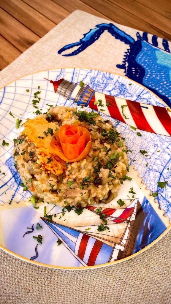 Risotto de Champiñones y langostinos con crujiente de parmesano. Foto: Daniela Malavé.