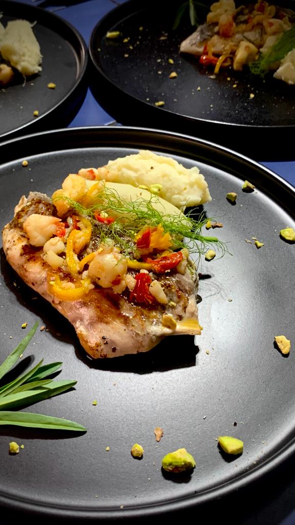 Churrasco de pargo en cocción lenta con crocante de pistacho, salsa de langostinos, puré de yuca y batata. Foto: Daniela Malavé.