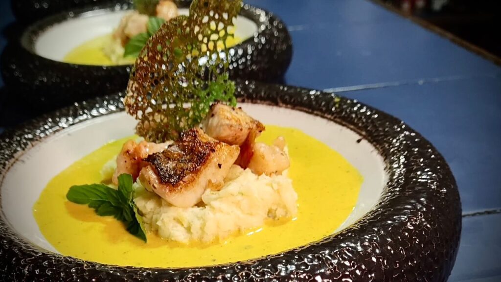 Dados de pargo y langostinos en cama de puré de papas, embebido en salsa de ají jobito, leche de coco y curry, coronado con falso coral. Foto: Daniela Malavé.