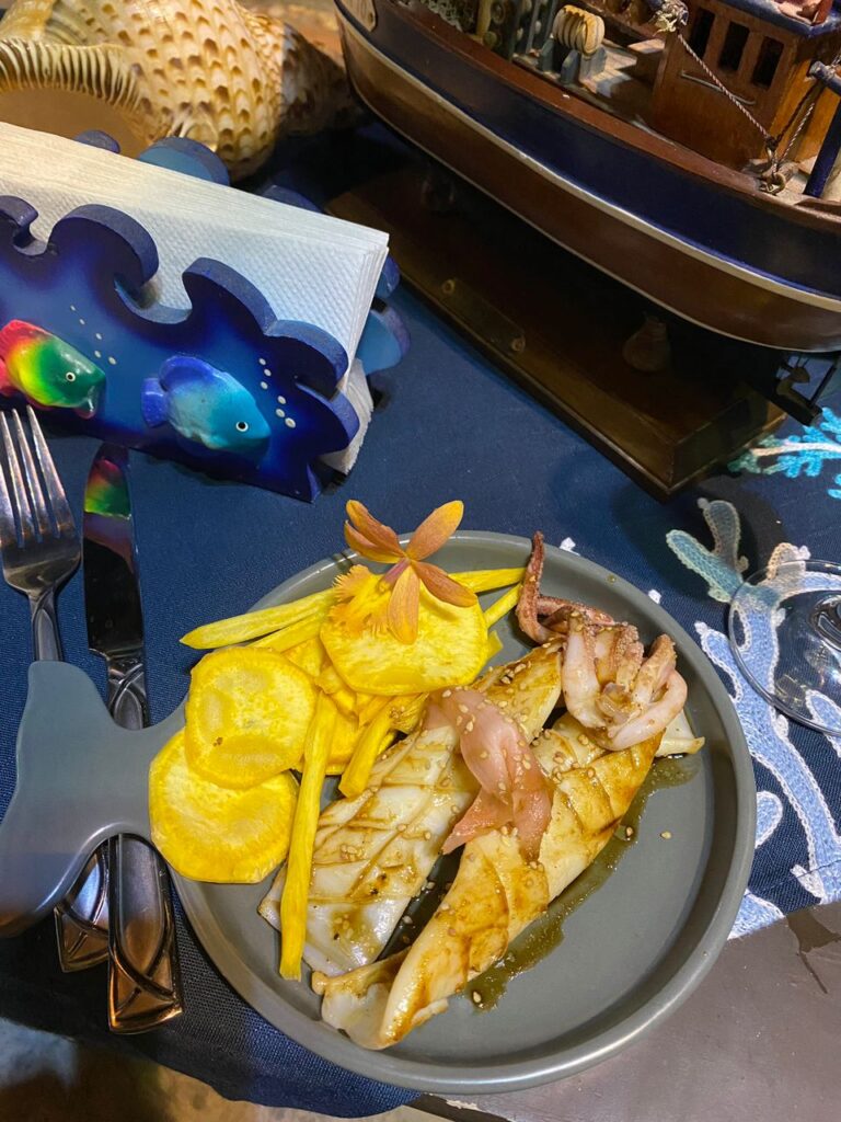 Calamares y cebollín al grill, batata frita, jengibre rosado y salsa thai. Foto: Ana González.