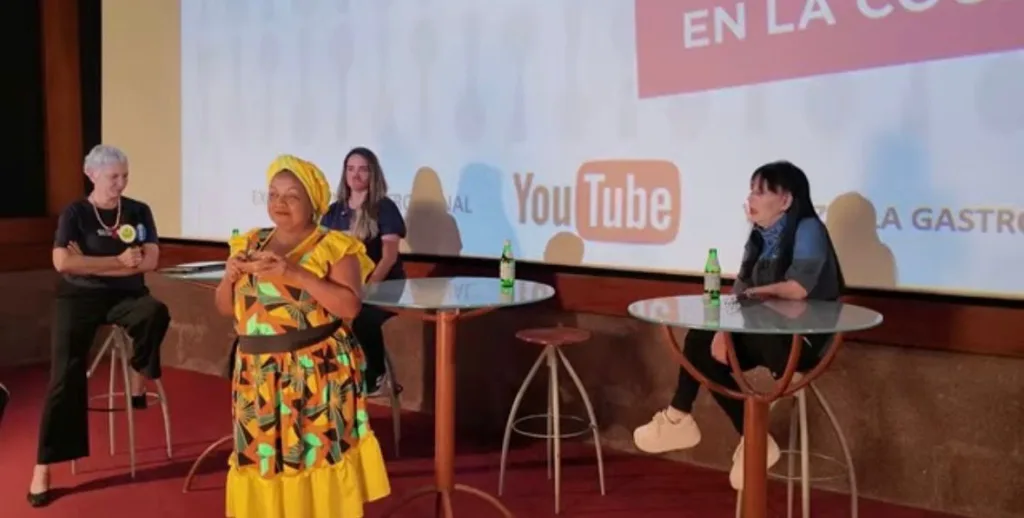 Nancy Estanga en el frente, durante la conversación «Mujeres en la cocina» que organizó Venezuela Gastronómica el 4 de marzo de 2026. Foto captura