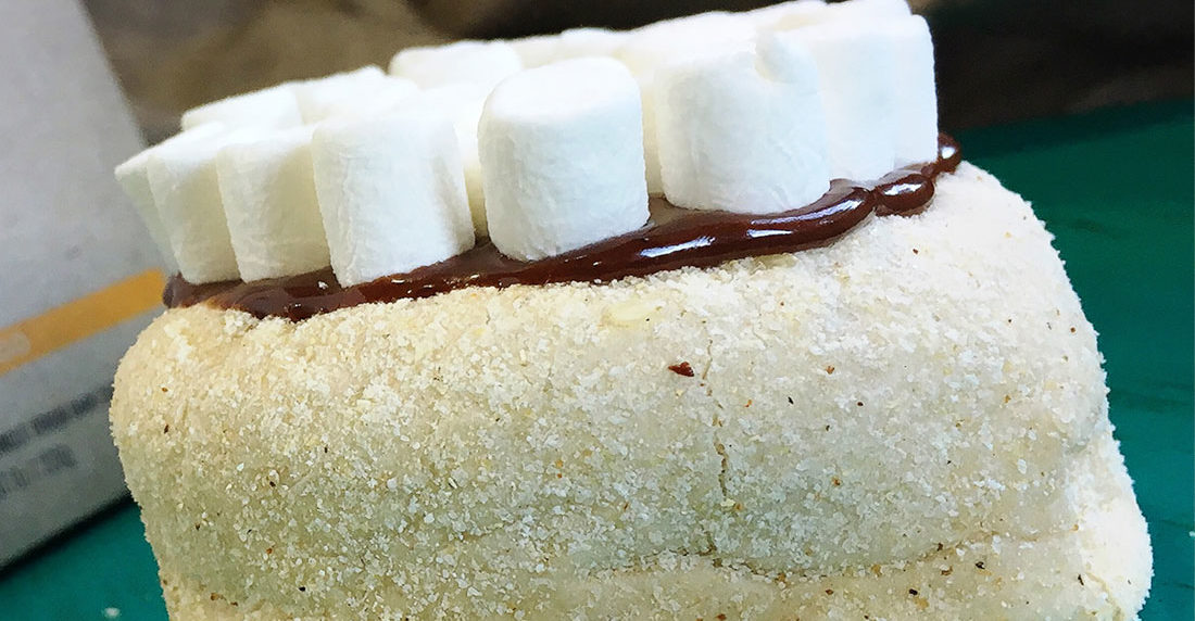 En una olla pequeña coloca todo el contenido de la lata de leche condensada y la tableta de chocolate en trozos. Lleva a fuego mínimo y no dejes de revolver para permitir que ambos se fundan en la más deliciosa mezcla de chocolate imaginable. Rellena los 4 english muffins y coloca las tapitas que guardaste.
