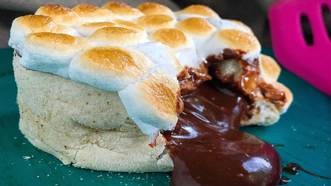 Con la ayuda de una brocha pinta con un poquito de la mezcla de chocolate para permitir que los malvaviscos miniaturas tengan donde pegarse. Coloca en círculos o desordenados pero únelos tanto como puedas. Lleva al horno y no le quites el ojo de encima o se quemarán. Solo debes esperar unos 2-3 minutos para que se inflen y doren como ves en la fotografía. Sirve individual en cada plato y adorna con hojas de menta o helado de vainilla.
