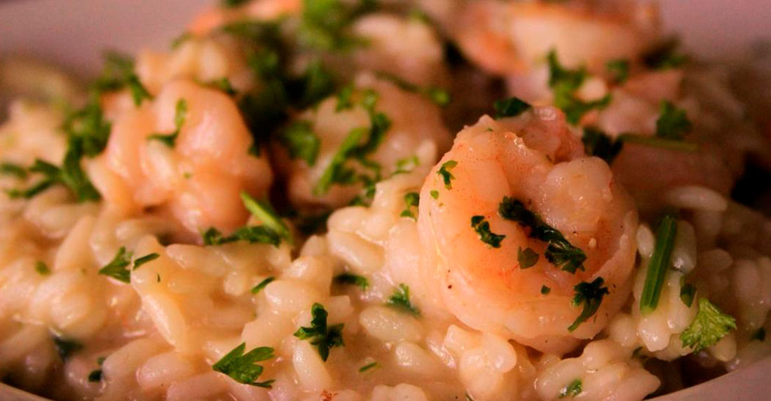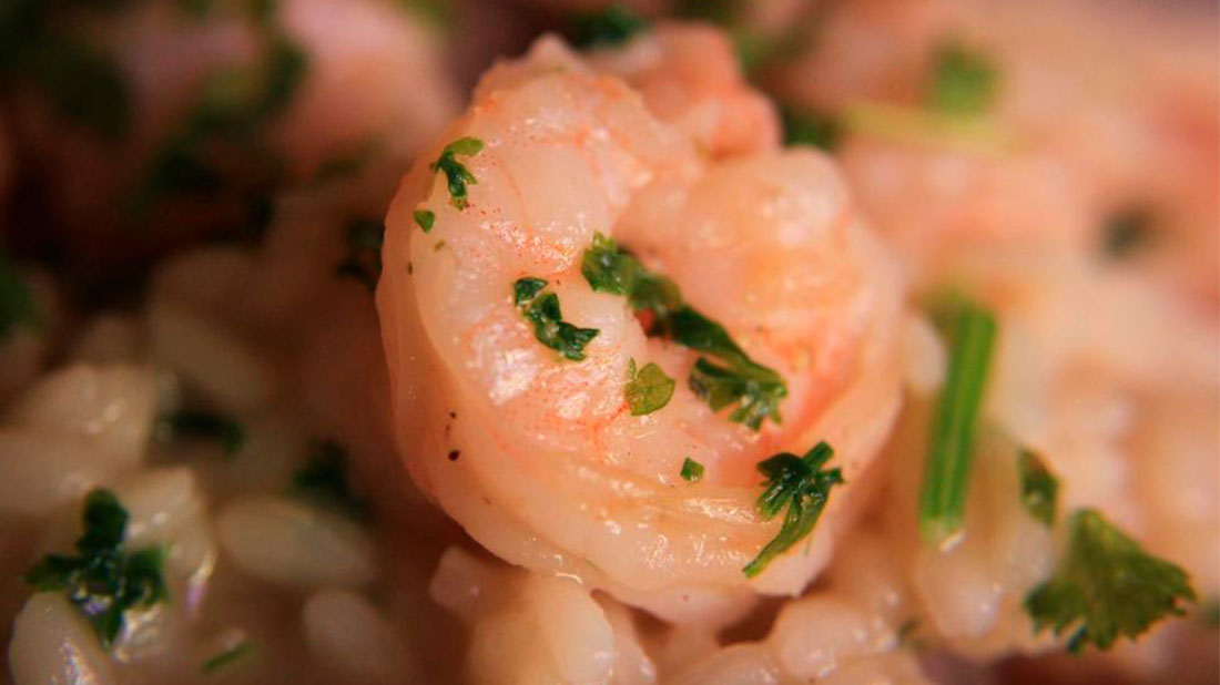 Poco a poco vamos agregando fumet caliente al arroz y paleteamos con amorosa paciencia. Cuando el goloso arroz se beba el caldo de pescado, le damos de beber una vez más. Y seguimos paleteando. Así: Paleta. Caldo caliente. Paleta. Fumet caliente. Paleta. Consomé caliente. Vamos testeando la consistencia del grano que para cada quién será distinta. El risotto es como un abrazo, a algunos les gusta suave y a otros que les cruja hasta los huesos. Cada uno determina su punto, y justo allí agregamos los camarones sellados y el vino blanco y paleteamos hasta que el arroz se embriague con el vino y lo evapore. Hacemos llover perejil fresco sobre el risotto.
