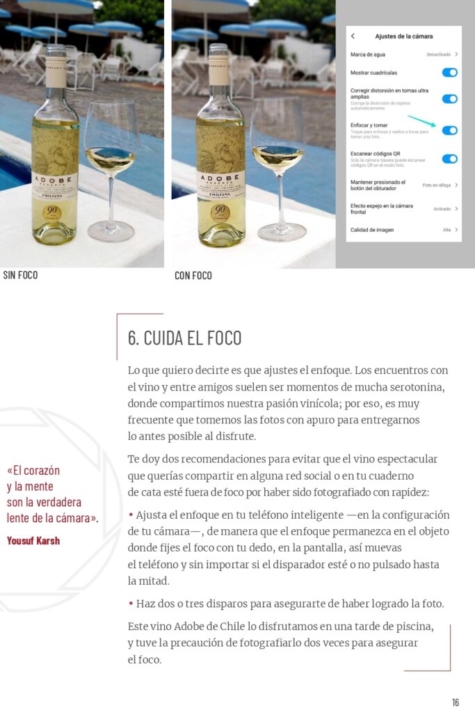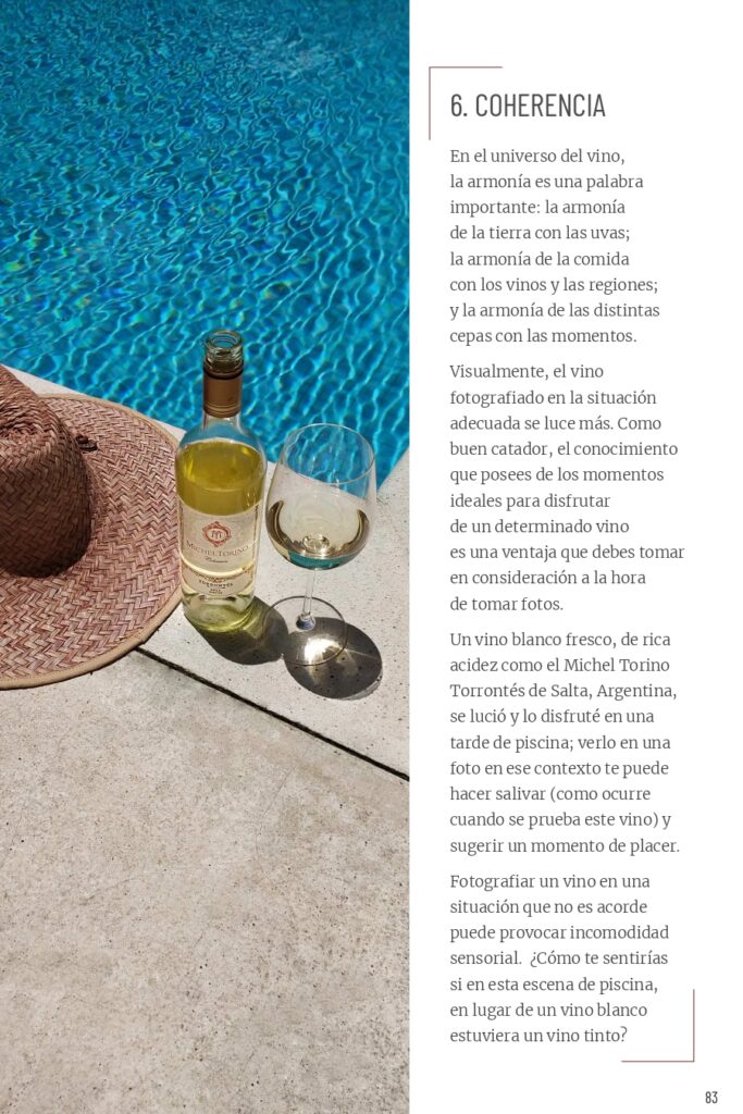 “Mi búsqueda en Catando la luz, Fotografía para wine lovers no son las fotos perfectas ni publicitarias. Lo que quiero mostrar es cómo conseguir las mejores fotos con los recursos disponibles en el momento –la luz, las líneas, los colores presentes- y con el mínimo de equipos. En mi caso la totalidad de las fotos de este libro fueron hechas con un Android Xiaomi Note 8”, señala Brand.