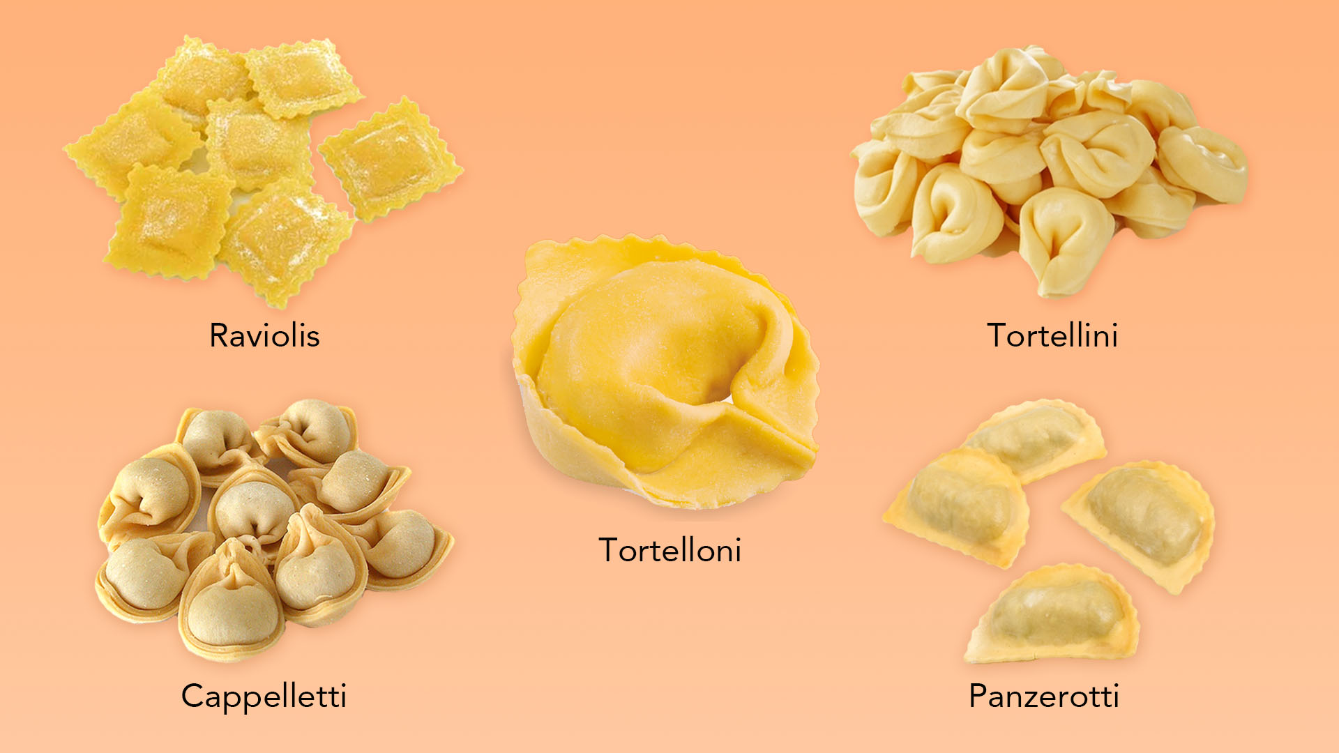 Rellenas.Los tipos de pasta más conocidos que entran dentro de esta lista son los tortellini y los ravioli, pero hay muchas más. Generalmente pueden estar rellenos de carne, frutos secos, verduras o quesos, y las salsas pueden combinarse de acuerdo al relleno.