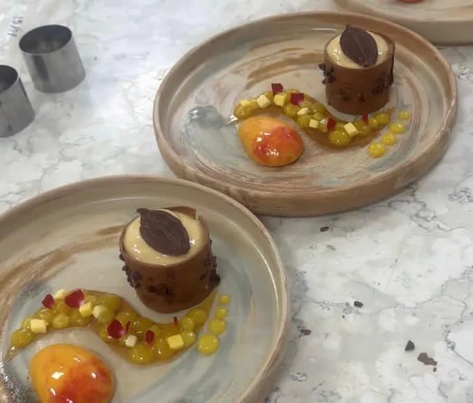 El postre ganador que presentó Venezuela brilló con los sabores venezolanos del cacao y el mango como protagonistas. Fue una composición de ganache cocida de cacao al 72%, espuma de mango y té negro, gelée de té y miel, jalea de mango con vainilla, mango lactofermentado verde y maduro, sorbete de mango y té y deco de chocolate