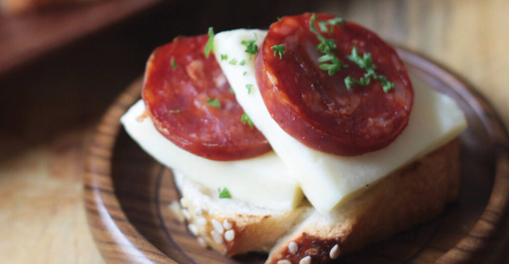 Para el montaje, coloque las rebanadas de pan tostado sobre una bandeja, luego sobre cada una ponga un triángulo de queso telita y dos rebanadas de chorizo carupanero. Para terminar, espolvoree el montadito con un poco de orégano fresco y pimienta negra recién molida.