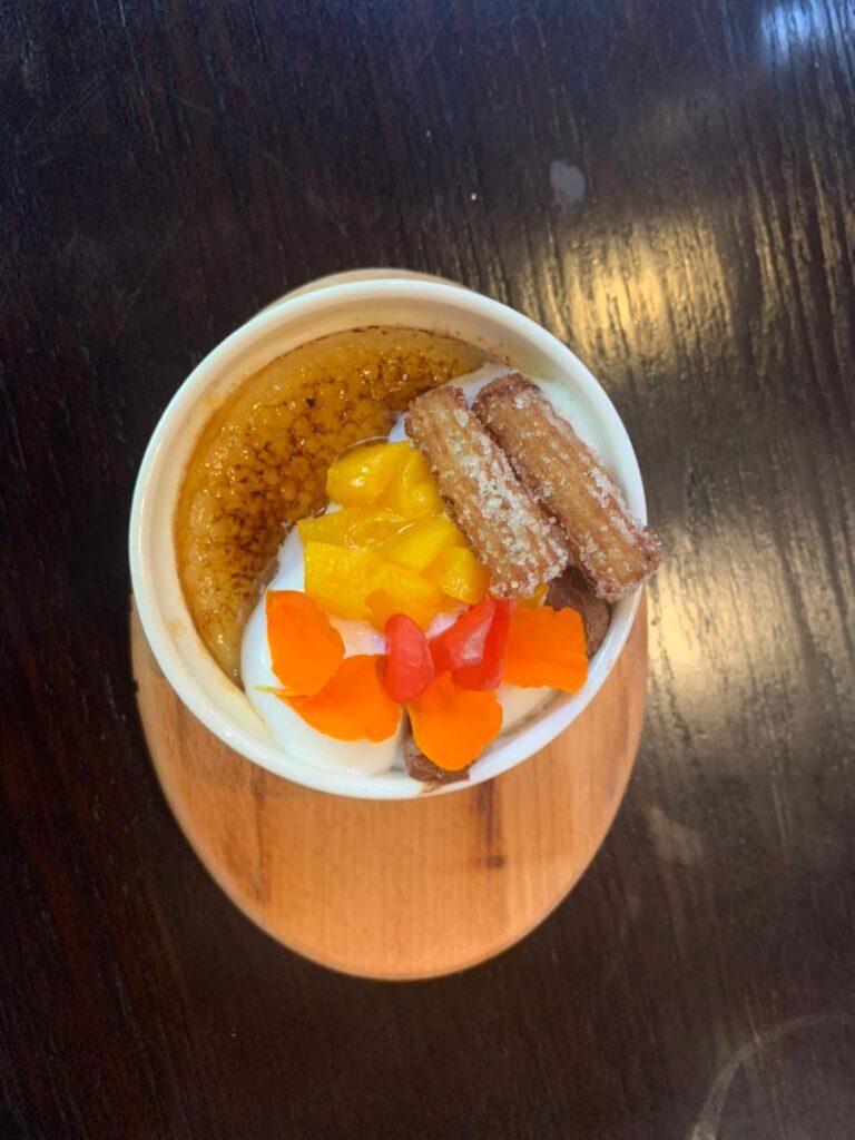 Formado también en técnicas culinarias francesas, además de nórdicas, el chef se atreve a darle su propio giro al tradicional postre galo, y le aporta el refrescante limón. Además lo acompaña con minichurros de cambur titiaro, trozos de fruta y algunos pétalos de flores comestibles. «Para mí estos son ingredientes exóticos», comenta.