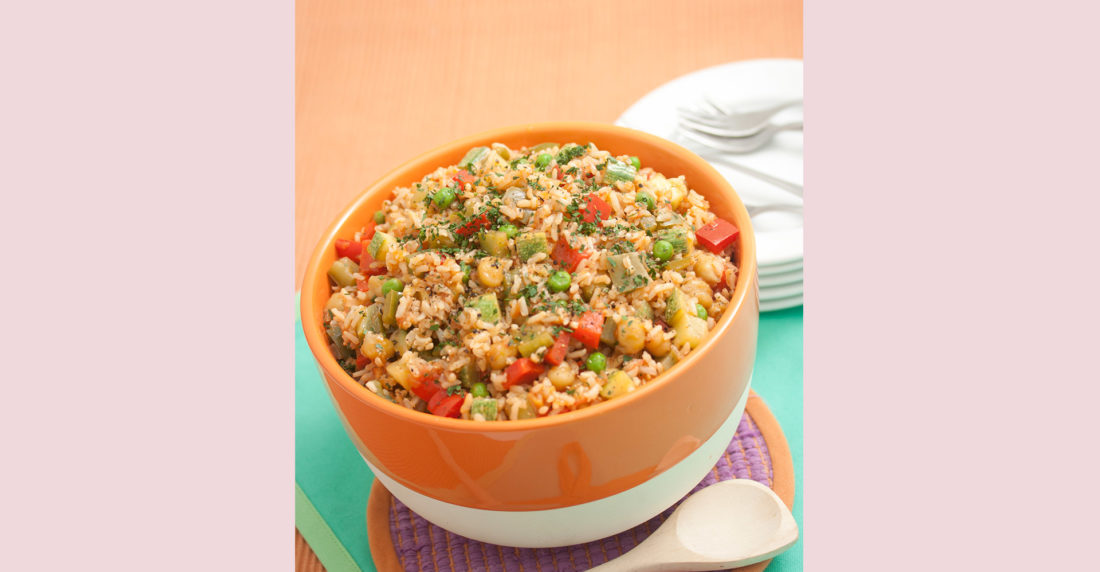 Añada el ajo cortado, déjelo cocinar por 1 minuto y seguido el arroz integral. Mezcle con los ingredientes del sofrito y cocine por unos 2 minutos.