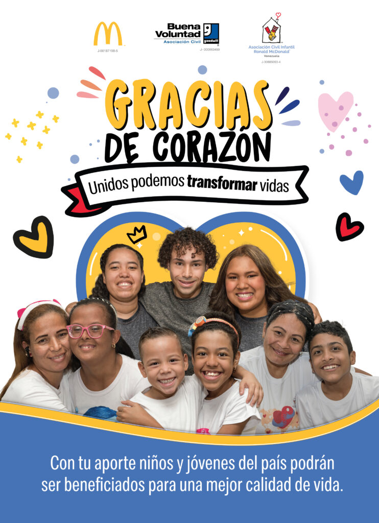 Comprando un corazón transformamos el futuro de la generación de relevo de Venezuela que no está siendo atendida y el de los padres que día a día trabajan para el futuro de sus hijos. Los corazones estarán a la venta tanto en los restaurantes como en la Casa Ronald McDonald’s @casaronaldvzla, ubicada en Valle Arriba y en @buenavoluntadve.