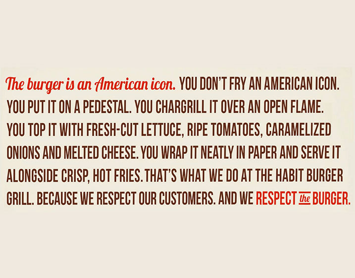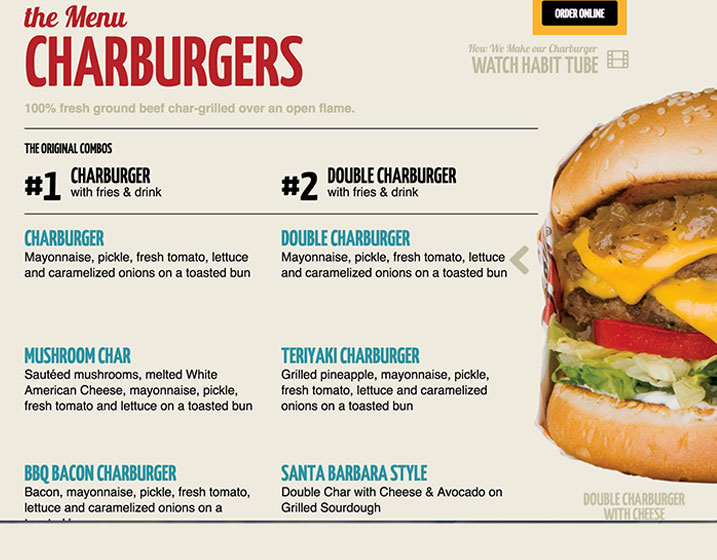 The Habit Burger Grill se toma muy en serio esto de preparar hamburguesas. Cuando uno llega a pedir su orden lo recibe la frase «Respect The Burguer» (respeta la hamburguesa en castellano). Aquí se ofrecen dos opciones principales en combo: la original Charburguer y la doublecharburger ambas elaboradas con carne de res, lechuga, tomate, cebollas caramelizadas, mayonesa y pepinillos. Vienen acompañadas de unas crocantes y humeantes papas fritas.