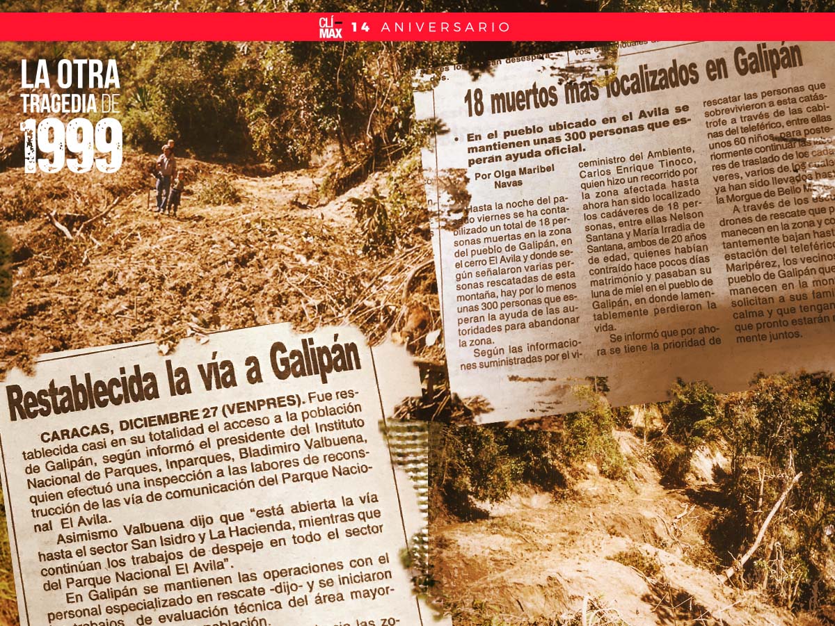 Antes de la tragedia de 1999, en Galipán hacían vida unos 2.000 habitantes, pero en apenas horas del 15 de diciembre ese número se redujo en más de una decena. El deslave causado por las incesantes lluvias arrastró tierra y personas en los sectores San Francisco, San Isidro, El Cacique y San José.