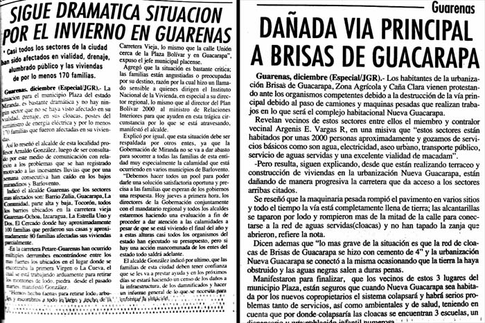 Por su parte, el entonces alcalde del municipio Plaza, Arnaldo González, declaró a la prensa que la situación era “bastante dramática y no hay ningún sector que no se haya visto afectado por su vialidad, drenaje, en sus cloacas, postes del suministro de energía eléctrica y por lo menos 170 familias” cuyas viviendas resultaron dañadas. Los sectores más afectados de Guarenas fueron Barrio Zulia, Guacarapa, La Comunidad, Tocorón, Izcaragua, La Estrella Uno y Dos, El Cercado.