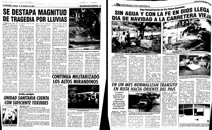 Petare, Guarenas, Guatire y Los Teques también fueron mencionados por la prensa de diciembre de 1999 como sectores afectados por las lluvias en el estado Miranda. Ríos desbordados, deslizamientos de tierra y carreteras obstaculizadas fueron lo más repetido, que también ocasionaron casas destruidas y vidas perdidas