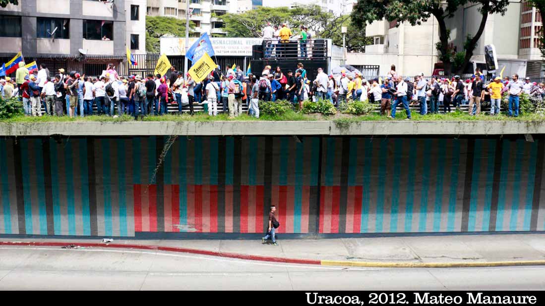 Igual sucede con el Jardín Lumínico I (2005) de la artista venezolana Patricia Van Dalen, que embellece 1,2 metros de la autopista Prados del Este con cerámicas multicolores. La policromía de Van Dalen se entrecorta con los espacios vacíos de baldosas caídas y con impactos de choques automovilísticos que la alejan de su geometría característica. Prácticamente oculto entre el monte, Muro de color aditivo (1975) de Cruz-Diez recorre a duras penas 1,3 metros de la ribera del río Guaire a la altura de Bello Monte. Las pinturas verde, azul, rojo y negro que se conjugan sobre acero ahora se confunden con la contaminación, los cuantiosos graffitis y la maleza, sin mayores espectadores que indigentes y fauna silvestre. Majestuosidad que se camufla con el caos.